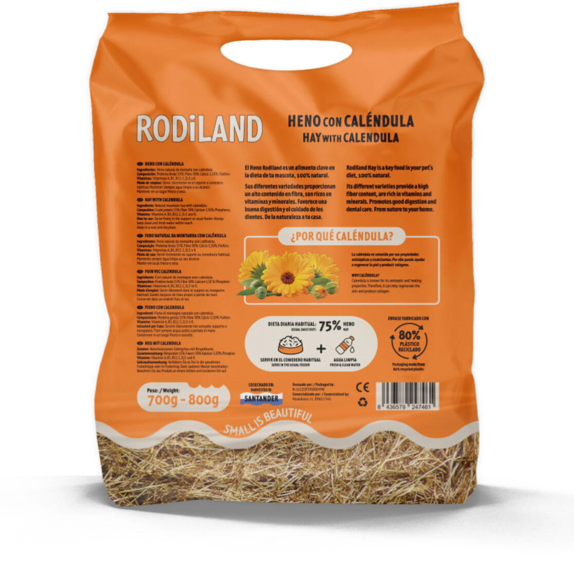 El briefing demandaba un mismo diseño adaptado a 4 tipos de heno que se diferenciaran lo suficiente y llamaran la atención en el lineal, por lo que se optó por utilizar una paleta vibrante de colores vivos en relación con la flor que marca la diferencia entre cada producto. Otro objetivo clave era mostrar el producto real, por lo que se seleccionó un material de fabricación transparente que se ajustara al presupuesto y se decidió dejar una reserva en la parte inferior utilizando el lenguaje gráfico de la marca Rodiland.